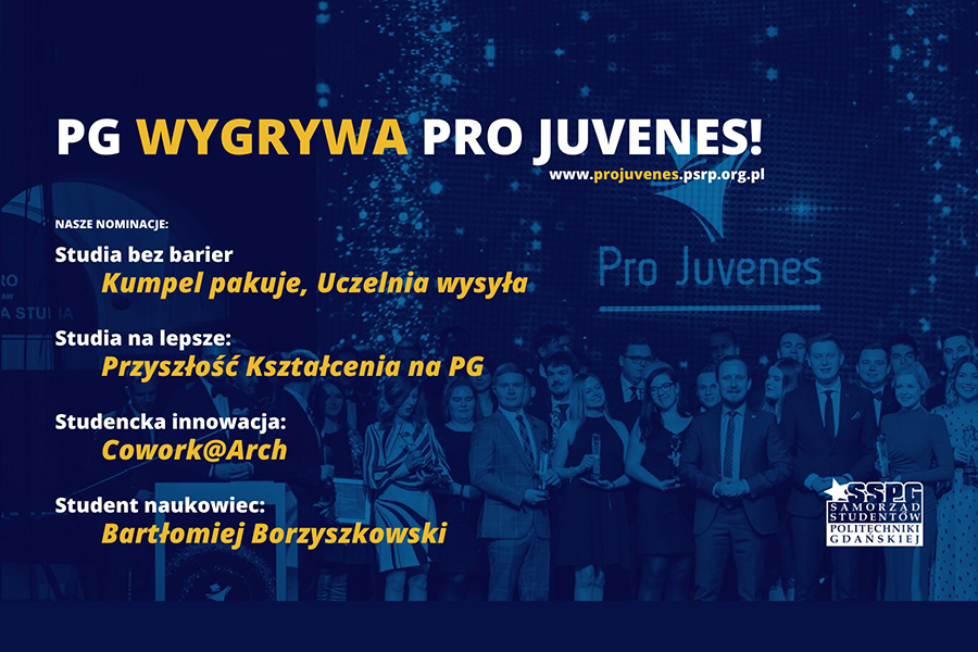 Nagrody „Pro Juvenes” to inicjatywa organizowana przez Parlament Studentów Rzeczypospolitej Polskiej od 2013 roku. Celem konkursu jest promowanie aktywnych studentów i ich inicjatyw oraz podkreślanie zasług osób i podmiotów przyjaznych studentom i wspierających potencjał młodych ludzi. Parlament Studentów RP, wręczając nagrody „Pro Juvenes”, chce w ten sposób tworzyć dobrą atmosferę wzajemnego współdziałania w środowisku akademickim oraz integrować studentów z całej Polski. Inicjatywy studentów naszej uczelni zostały nominowane w czterech kategoriach: Studia bez barier, Studencka innowacja, Studia na lepsze oraz Student Naukowiec.