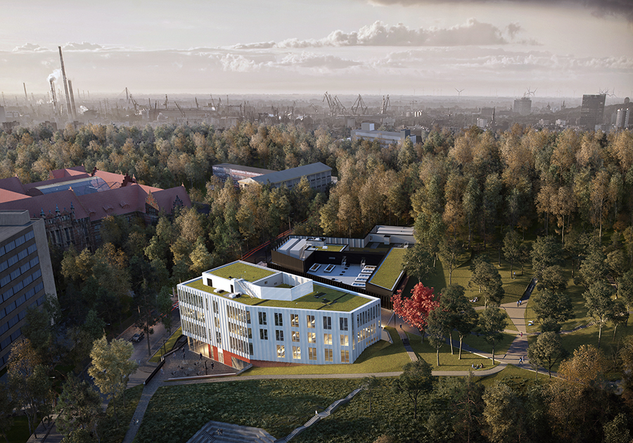 Obiekt, zaprojektowany przez pracownię architektoniczną Arch-Deco, będzie osadzony na jednym fundamencie, ale jednocześnie przedzielony osią widokową skierowaną na Gmach Główny PG.