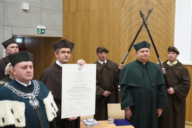 – Otrzymany tytuł doktora honoris causa Politechniki Lubelskiej – najwyższe wyróżnienie akademickie – sprawił mi olbrzymią radość i satysfakcję.– mówił dziekan WIMiO prof. Andrzej Seweryn. – Ten zaszczyt jest dla mnie tym większy, że Politechnika Lubelska, która go przyznała, choć jest nie największą, to jednak znakomicie zarządzaną uczelnią, prowadzącą badania i kształcenie na najwyższym poziomie. Serdecznie dziękuję wszystkim osobom, które przyczyniły się do tego wyróżnienia, a szczególnie rektorowi Politechniki Lubelskiej prof. Zbigniewowi Paterowi, który był inicjatorem całego postępowania i jego „dobrym duchem” na każdym etapie oraz Senatowi Politechniki Lubelskiej, który przyznał mi tę godność, a także Radzie Dyscypliny Naukowej Inżynieria Mechaniczna, która zainicjowała postępowanie. Bardzo dziękuję mojemu promotorowi – prof. Tomaszowi Sadowskiemu, wybitnemu uczonemu o światowej randze, a także recenzentom w osobach wybitnych przedstawicieli nauki i szkolnictwa wyższego: prof. Arkadiuszowi Mężykowi – rektorowi Politechniki Śląskiej, prof. Zbigniewowi Korubie – rektorowi Politechniki Świętokrzyskiej oraz prof. Jarosławowi Sępowi – prorektorowi Politechniki Rzeszowskiej. Dziękuję Senatom Politechniki Rzeszowskiej, Politechniki Śląskiej oraz Politechniki Świętokrzyskiej za poparcie wniosku o nadanie doktoratu honorowego.