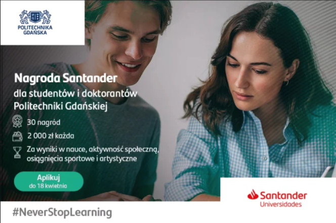 Dzięki współpracy Politechniki Gdańskiej z Santander Universidades rozpoczął się nabór na kolejną edycję Nagrody Santander dla wyróżniających się studentów PG. Pierwszy raz do udziału w konkursie zaproszeni zostali również doktoranci Szkoły Doktorskiej oraz Szkoły Doktorskiej Wdrożeniowej PG.