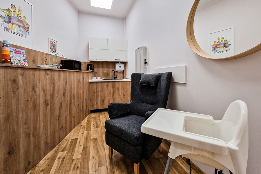 Pomieszczenie ma powierzchnię ~8m2 i jest ogólnodostępną przestrzenią socjalną. Do dyspozycji gości jest przewijak, mikrofalówka, wygodny fotel oraz zabawki dla dzieci. Punkt karmienia otwarty jest w godzinach dostępności budynku.