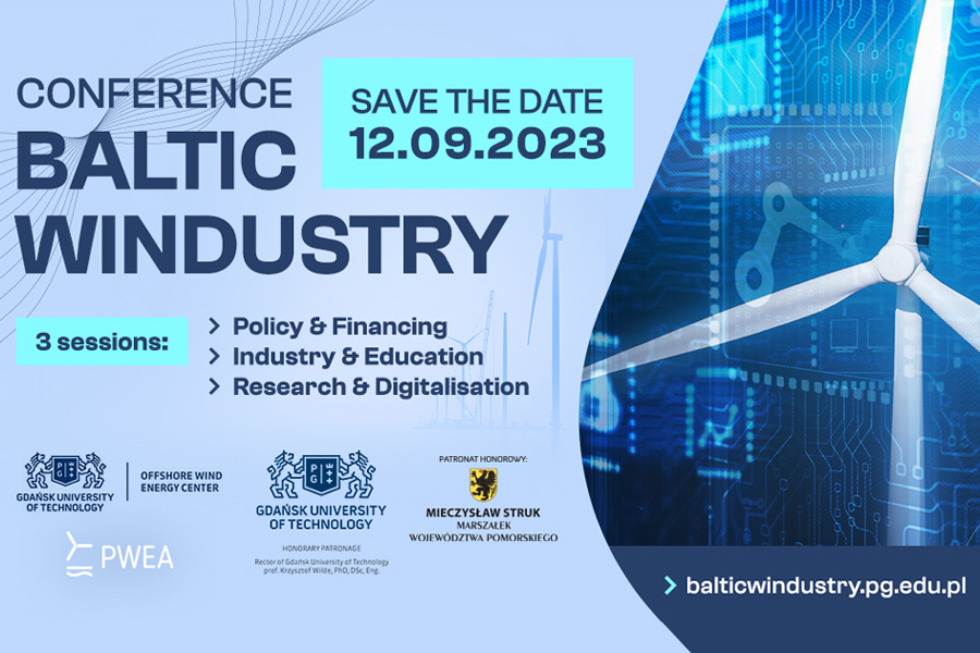 Konferencja „Baltic WINDUSTRY 2023: industrial research in offshore wind energy” organizowana jest przez Centrum Morskiej Energetyki Wiatrowej Politechniki Gdańskiej we współpracy z Polskim Stowarzyszeniem Energetyki Wiatrowej. Wydarzenie objęte zostało patronatem honorowym rektora PG prof. Krzysztofa Wildego oraz marszałka województwa pomorskiego Mieczysława Struka.