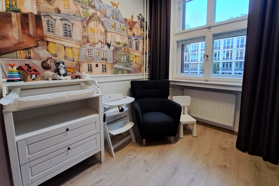 Pomieszczenie zostało wyremontowane i przytulnie zaaranżowane. Mimo niewielkiej przestrzeni znalazło się tu miejsce na niezbędne sprzęty: wygodny fotel dla rodzica, fotelik do karmienia, przewijak, zabawki oraz aneks kuchenny z mikrofalówką i czajnikiem. Pokój stanowi przestrzeń socjalną dostępną dla całych rodzin w godzinach otwarcia budynku.