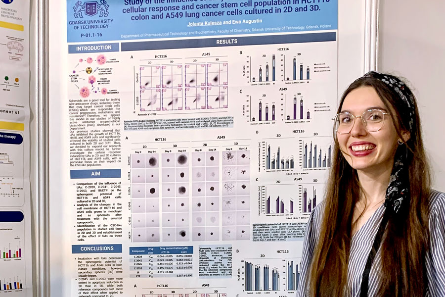 Rozprawa doktorska pt. "Comparison of 2D and 3D culture models in the studies of the biological response induced by unsymmetrical bisacridines in cancer cells" („Porównanie modeli hodowli 2D i 3D w badaniach odpowiedzi biologicznej indukowanej przez niesymetryczne bisakrydyny w komórkach nowotworowych") została napisana pod kierunkiem prof. Ewy Augustin z Katedry Technologii Leków i Biochemii na Wydziale Chemicznym.