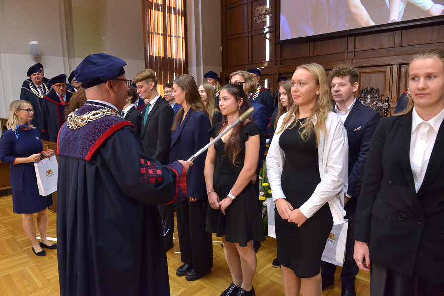 Kolejnym punktem uroczystości była immatrykulacja studentów. Ślubowanie złożyli najlepsi nowo przyjęci przedstawiciele wszystkich ośmiu wydziałów. Gratulacje odbierali z rąk Aleksandry Dulkiewicz, prezydent Gdańska oraz prof. Krzysztofa Wildego, rektora PG.