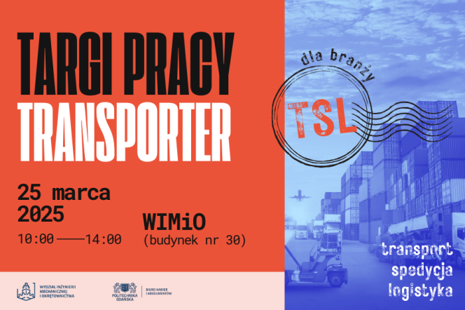 Biuro Karier i Absolwentów oraz Wydział Inżynierii Mechanicznej i Okrętownictwa szapraszają na Targi Pracy TRANSPORTER, które łączą studentów i absolwentów z przedstawicielami branży TSL ( transport, spedycja, logistyka).