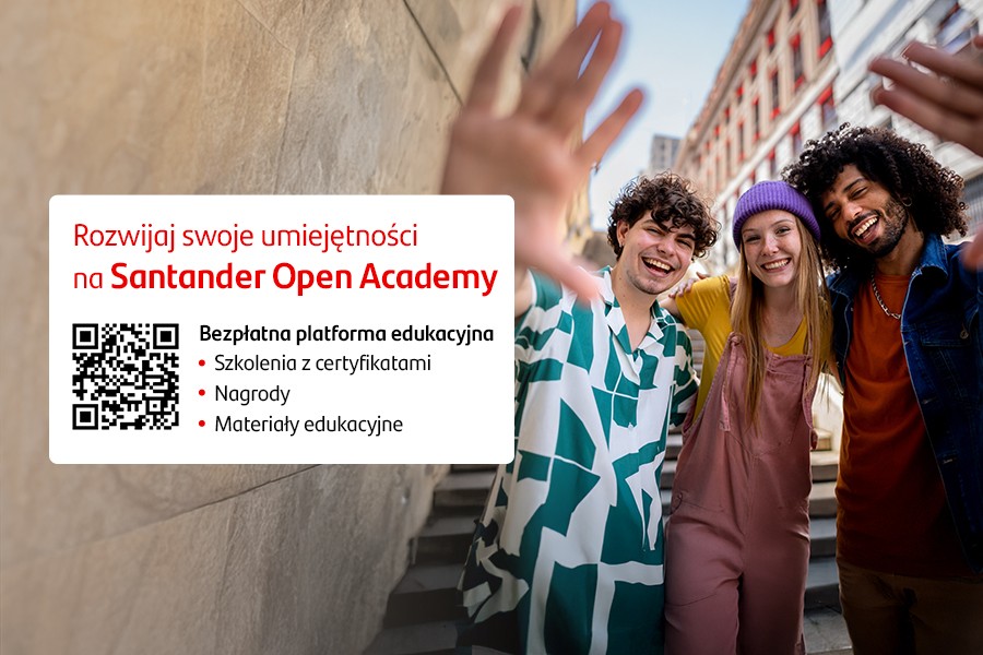 Zajdź szkolenie dla siebie na Santander Open Academy. Jest to globalna, bezpłatna platforma edukacyjna. Znajdziesz na niej szkolenia, nagrody finansowe i materiały edukacyjne, dzięki którym rozwiniesz kompetencje i zwiększysz swoje szanse na rynku pracy.