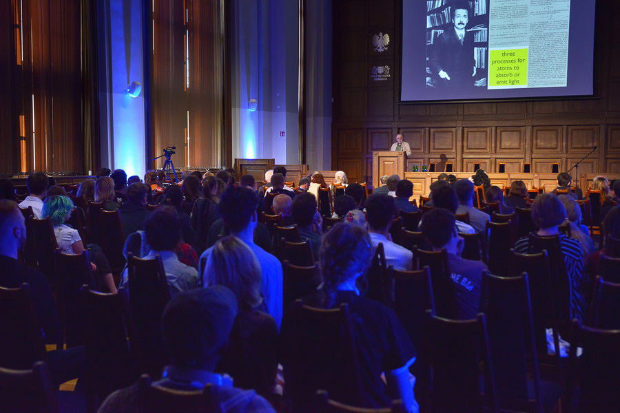 W drugiej części spotkania profesor Michael Berry z Wielkiej Brytanii, który odkrył zjawisko kwantowe obecnie nazwane jego imieniem, z pasją i poczuciem humoru opowiedział o tym, jak mechanika kwantowa wpływa na rozwój nowoczesnych technologii, a także wyjaśnił skąd bierze się żółty kolor złota.