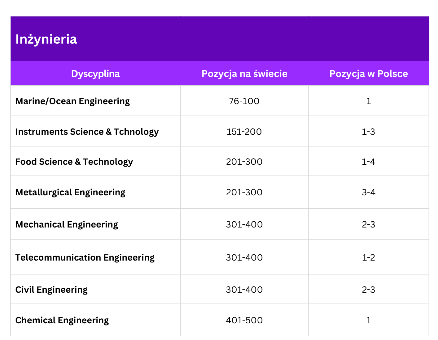 Food Science & Technology, Metallurgical Engineering, Telecommunication Engineering, Civil Engineering, Mechanical Engineering oraz Chemical Engineering.