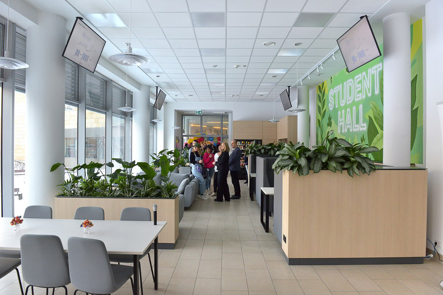 Student Hall to nowoczesne centrum życia akademickiego. Przestrzeń zaprojektowana z myślą o studentach, sprzyjająca nauce i współpracy. To przyjazna strefa spotkań wypełniona żywą zielenią, która pozytywnie wpływa na regenerację w codziennym rytmie studenckiego życia.