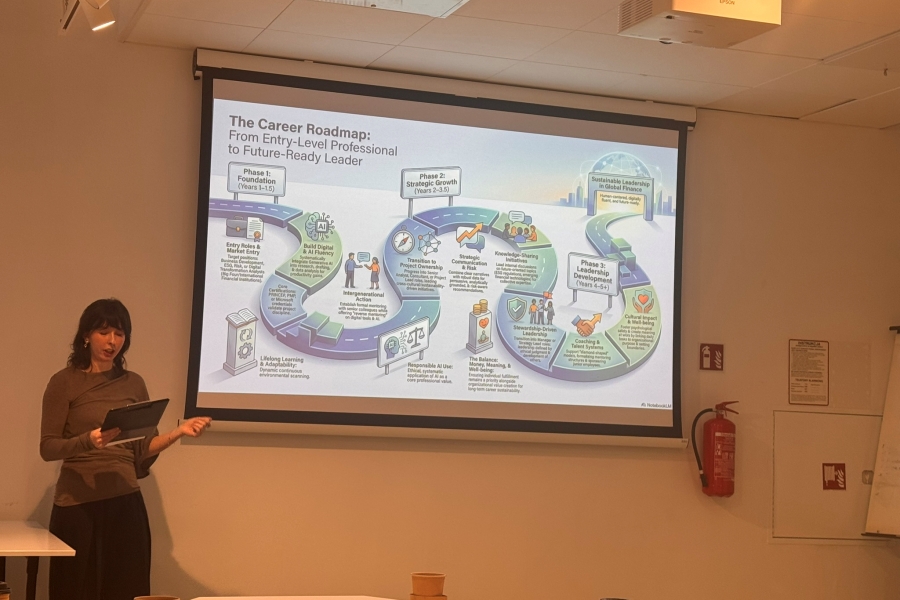Studenci analizowali sektory finansów, edukacji i sztucznej inteligencji jako potencjalne przyszłe miejsca pracy, oceniając je przez pryzmat zdiagnozowanych kompetencji – identyfikując mocne strony, luki i to, w jaki sposób umiejętności przekładają się na dzisiejszy rynek pracy. Praktyczną uwagę poświęcono odpowiedniemu zaprezentowaniu się bez dużego doświadczenia: jak skonstruować CV, by przekazać swój potencjał i zbudować spójną historię zawodową i dlaczego LinkedIn jest niezwykle ważnym narzędziem, a nie tylko profilem online.