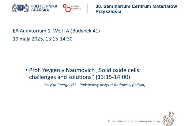Gość zaproszony przez Centrum Materiałów Przyszłości oraz Centrum Technologii Wodorowych Politechniki Gdańskiej - Prof. Yevgeniy Naumovich z Instytutu Energetyki - Państwowego Instytutu Badawczego (Polska) przedstawi wykład pt. "Solid oxide cells: challenges and solutions".