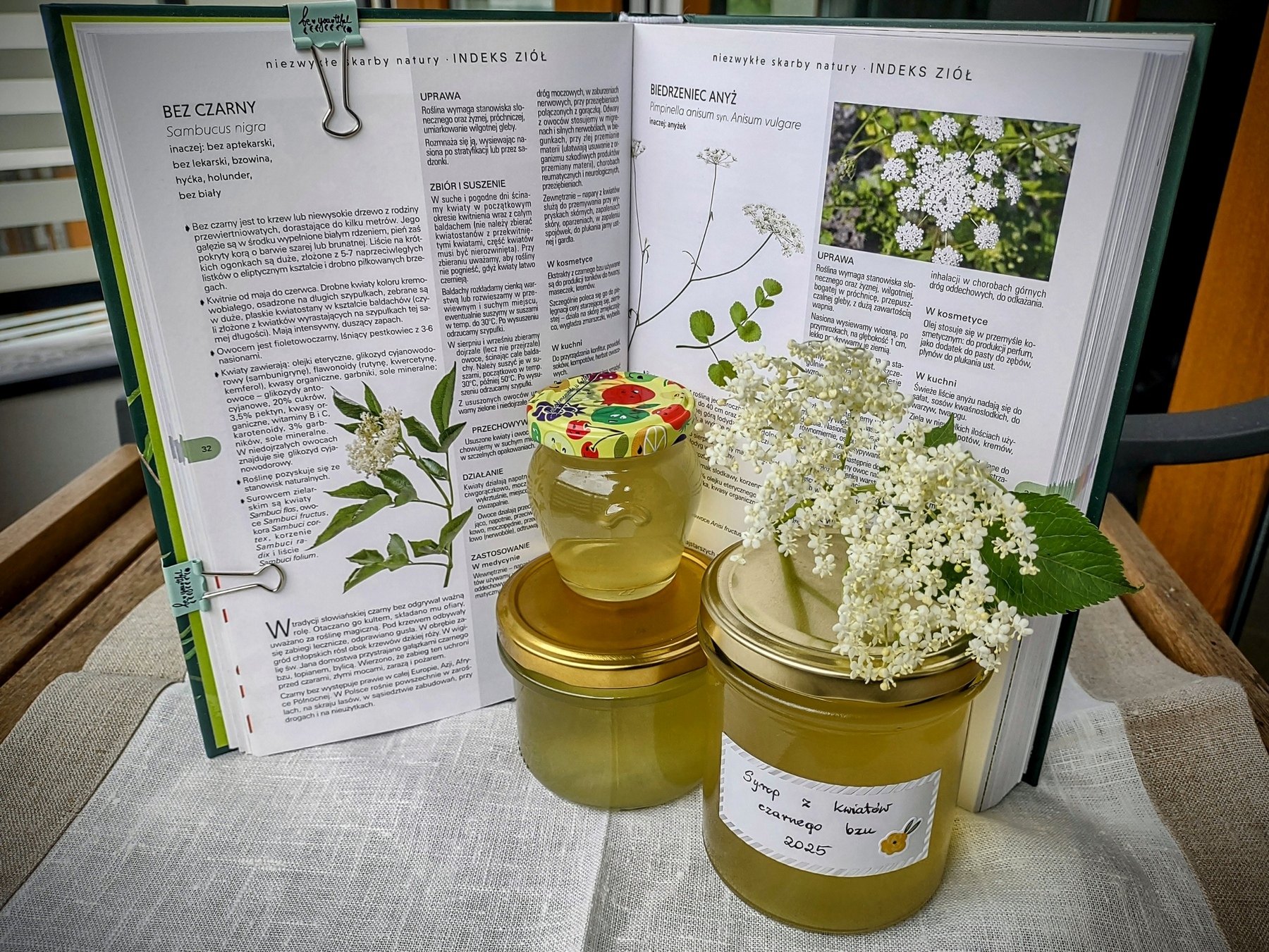 Od Autorki zdjęcia: "Okoliczności wykonania fotografii: Książka była inspiracją do przygotowania syropu z kwiatów z czarnego bzu. Kwiaty na syrop zostały przywiezione z podróży w rodzinne strony, gdzie miałam możliwość zebrać ekologiczny surowiec podczas spacerów na łonie natury. Taki syrop jest nie tylko zdrowy, ale też pyszny jako dodatek do lemoniady w gorący wakacyjny dzień!