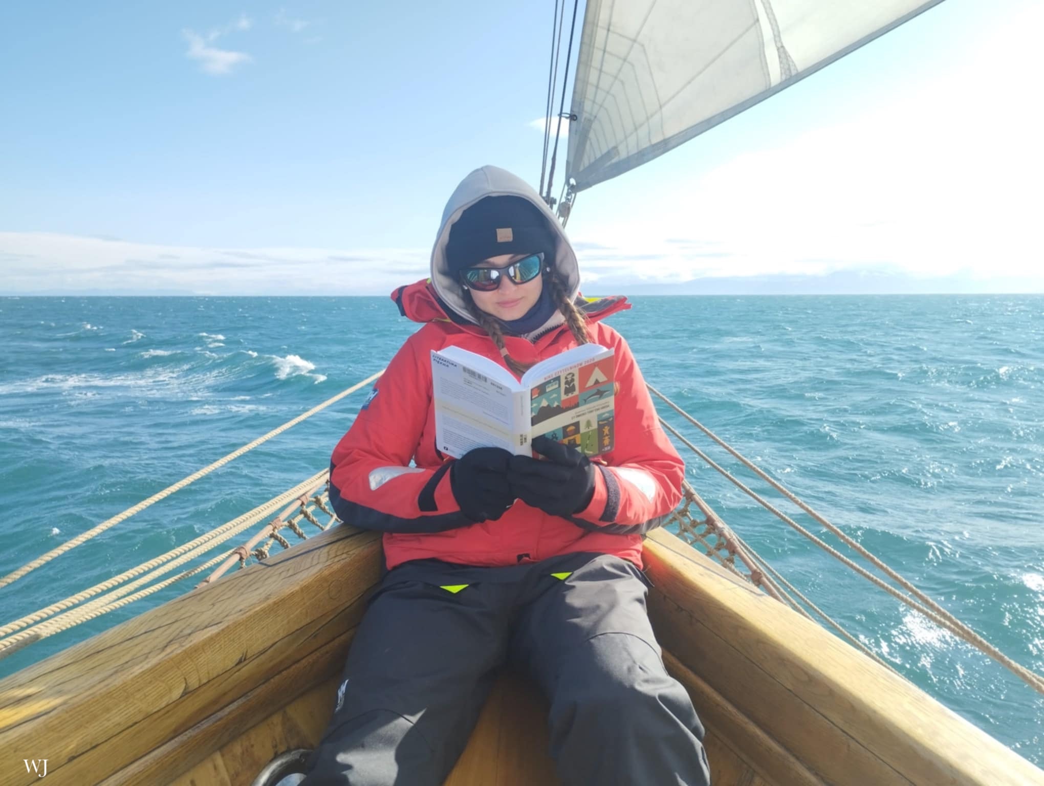 Od Autorki zdjęcia: "Książka towarzyszyła mi na jubileuszowej wyprawie na Spitsbergen na 50. rocznicę historycznego rejsu s/y Generała Zaruskiego, który jako pierwszy polski jacht dotarł do stacji badawczej w Hornsundzie na Spitsbergenie. Spędziła ze mną miesiąc na żaglowcu oraz znalazła się na Arktyce. Miejsce zrobienia fotografii to cieśnina Forlandsundet. Rejs jest najlepszym miejscem na refleksje, których ta książka wymaga. Pozycja wyczerpująca emocjonalnie, ale istotna, dająca nadzieję na choćby częściową sprawiedliwość na świecie".