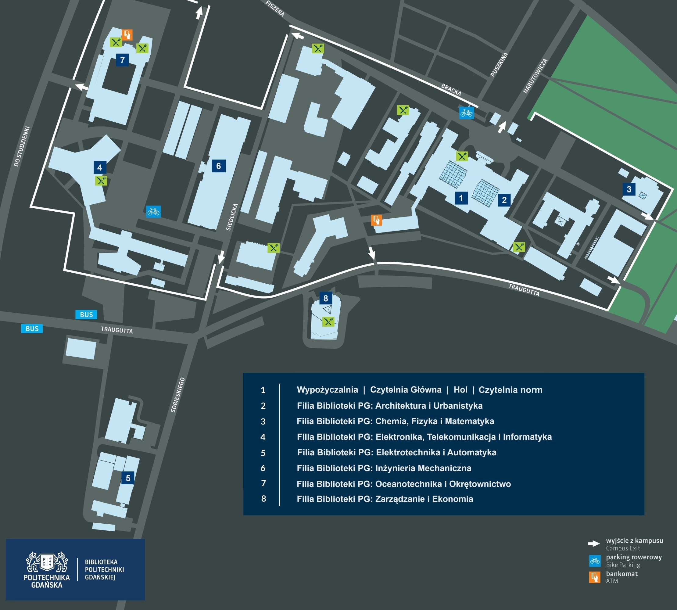 W skład Biblioteki Politechniki Gdańskiej wchodzą Biblioteka Główna oraz siedem filii. Każda z lokalizacji oferuje przestrzeń do nauki i pracy dla użytkowników.