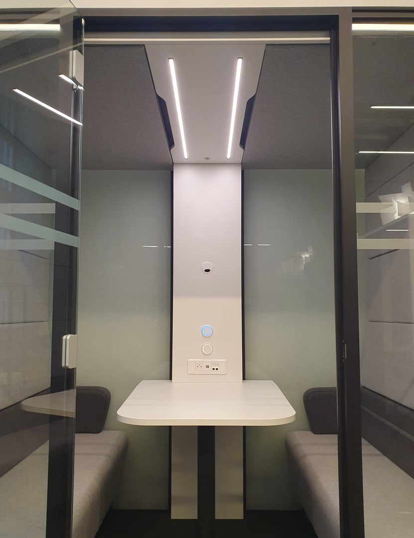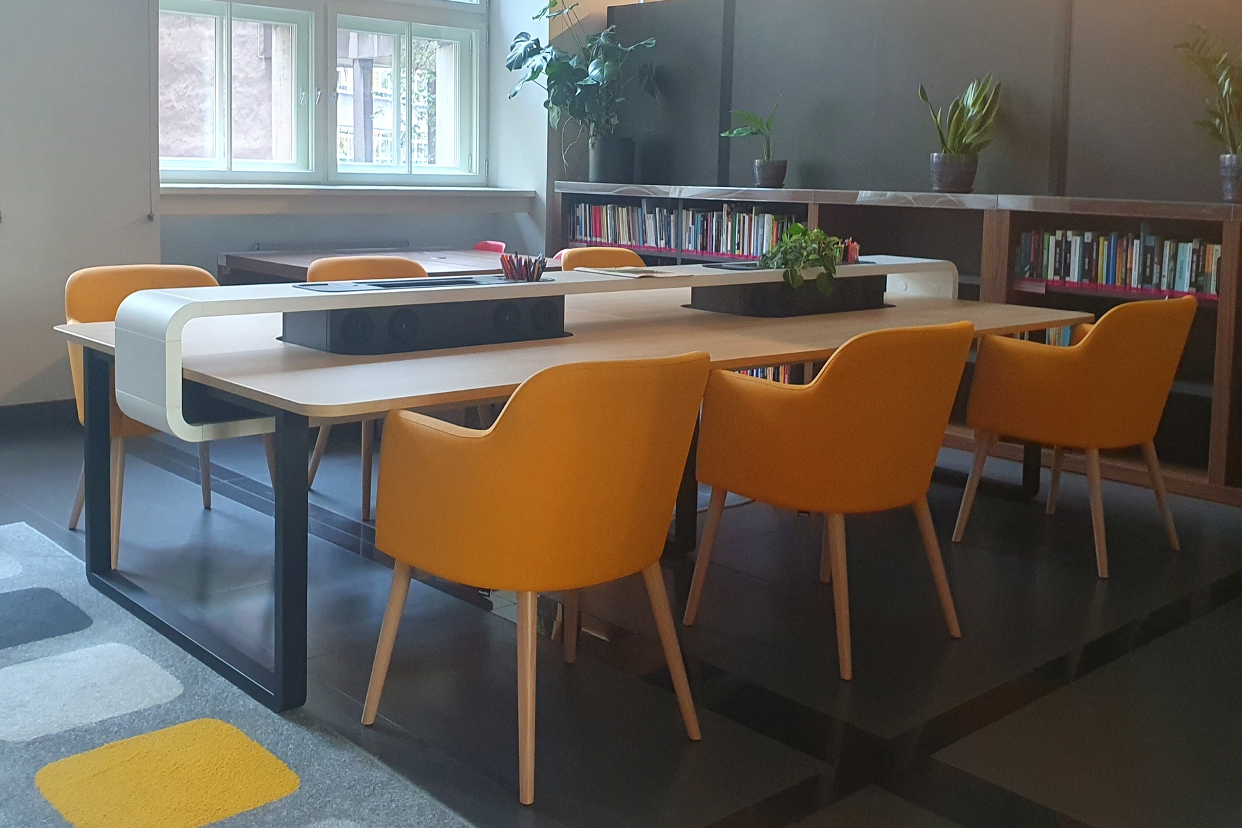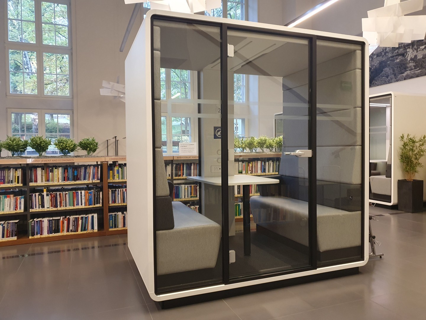 - wyposażenie: nowoczesny wielostanowiskowy stół do pracy w trybie hot-desking, tablica akustyczna suchościeralna, 1 obrotowy fotel akustyczny wyposażony w mechanizm ruchomej przesłony oraz ładowarkę USB, możliwość skorzystania z gier planszowych