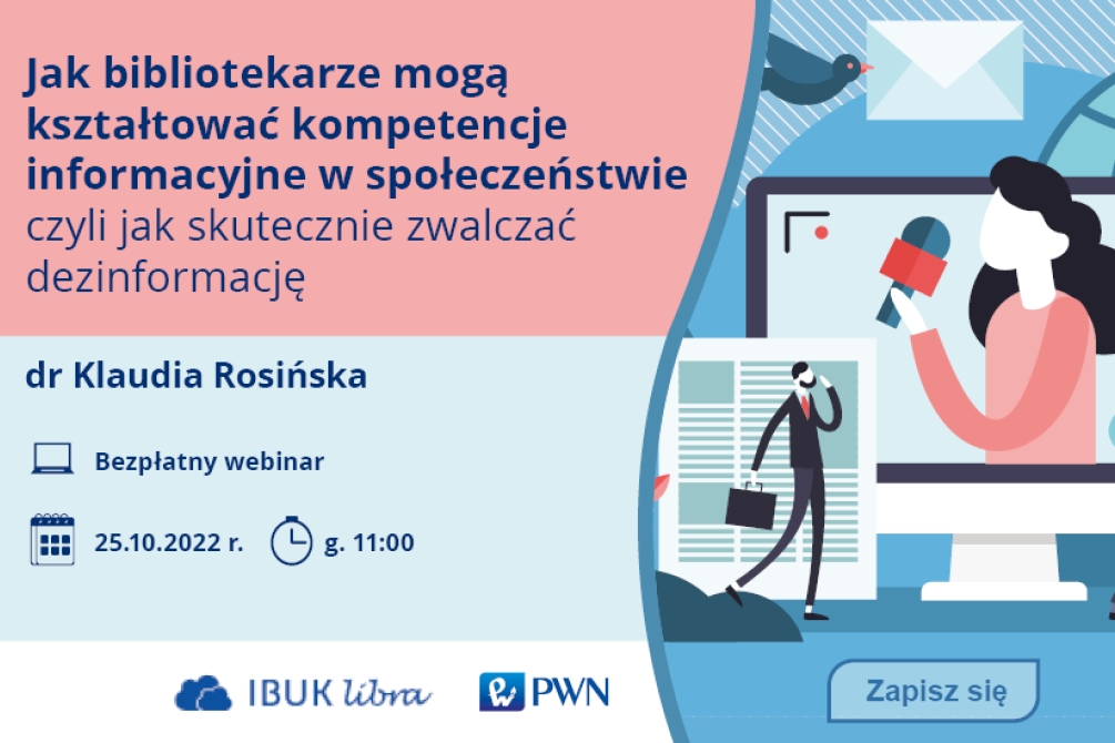 Chcesz lepiej rozumieć potrzeby zarówno czytelnika jak i otaczającego nas, coraz bardziej zcyfryzowanego świata oraz umieć obronić się przed fake news’ami? Zapisz się na webinar już teraz (zajmie to 1 minutę), ilość miejsc ograniczona. W czasie webinarium na czacie będzie można zadać pytania prelegentce.