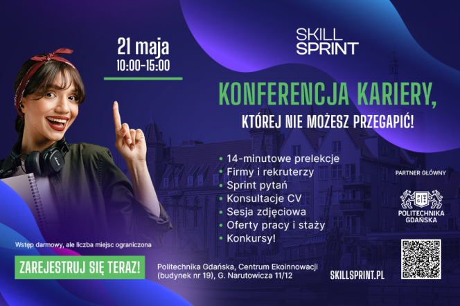 Skill Sprint to wydarzenie, które od ponad roku towarzyszy studentom polskich uczelni, a już 21 maja, zawita na Politechnikę Gdańską, aby połączyć osoby szukające swojej ścieżki zawodowej z ekspertami z wielu branż. Uczestnicy wydarzenia będą mogli zdobyć konkretne wskazówki dotyczące rozwoju kariery, tworzenia CV oraz otrzymać wsparcie w zaplanowaniu ścieżki zawodowej.
