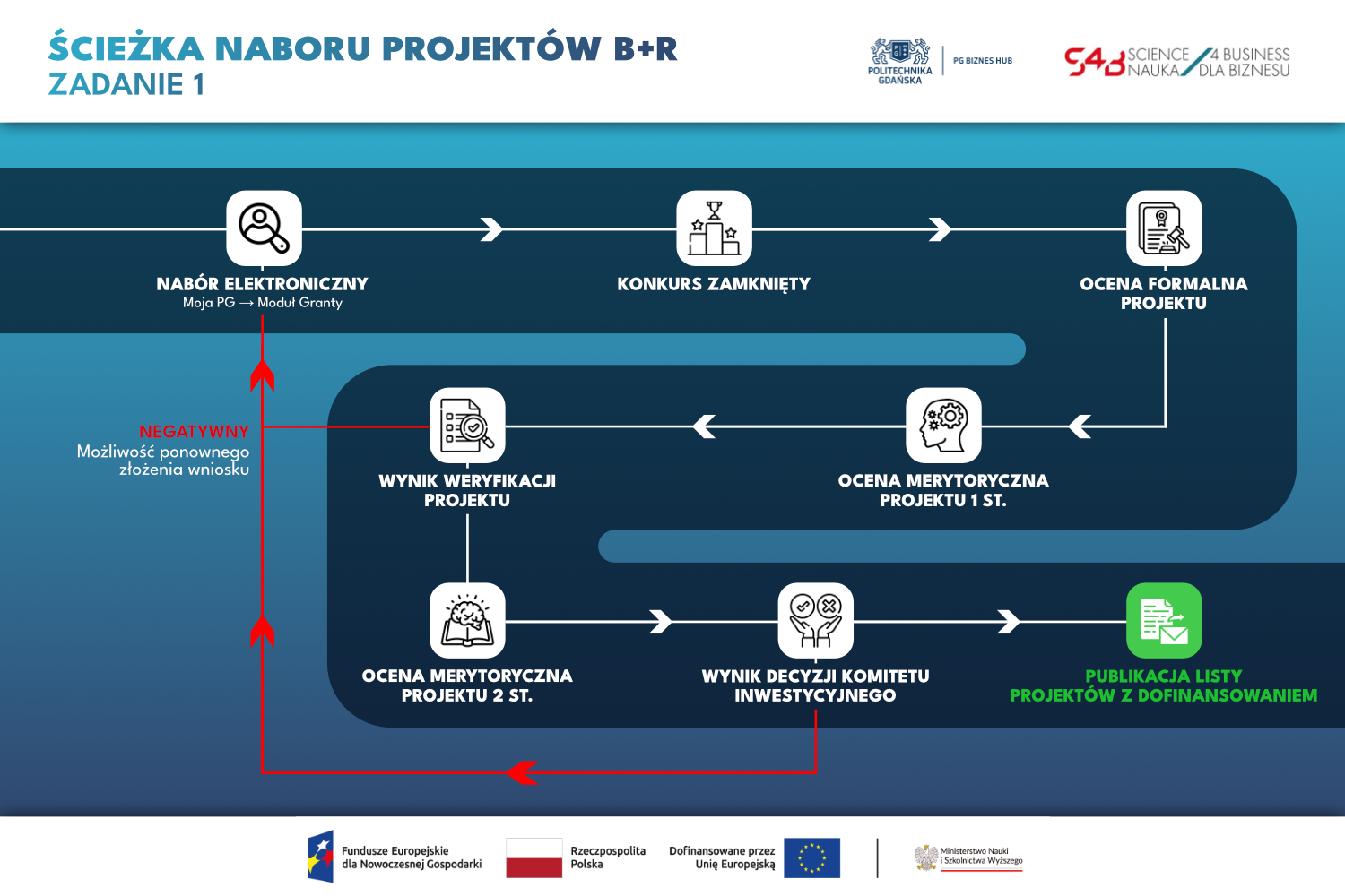 Rozpoczynamy ocenę i wybór projektów B+R według zdefiniowanej ścieżki (grafika), a ostateczne decyzje o zakwalifikowaniu projektów do finansowania podejmie Komitet Inwestycyjny, złożony z przedstawicieli biznesu oraz pracowników naukowych.