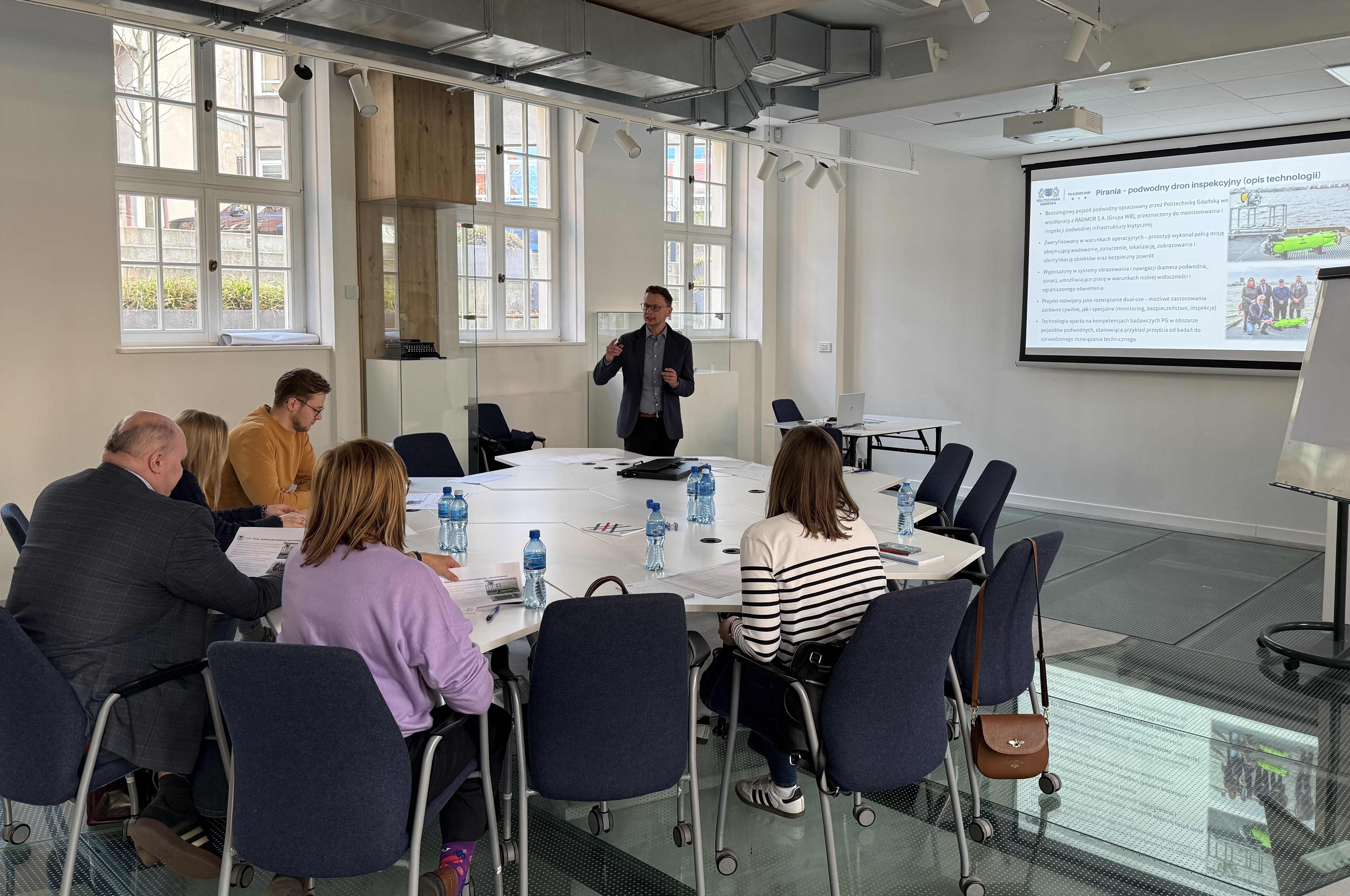 Warsztat poprowadził Marcin Stolarek, Główny Specjalista ds. komercjalizacji technologii w PG Biznes Hub, odpowiedzialny za wsparcie brokerów innowacji i zespołów badawczych Politechniki Gdańskiej w procesach transferu technologii do gospodarki. W swojej pracy specjalizuje się w ocenie potencjału biznesowego wyników badań, tworzeniu modeli biznesowych oraz przygotowywaniu ofert współpracy dla przemysłu.