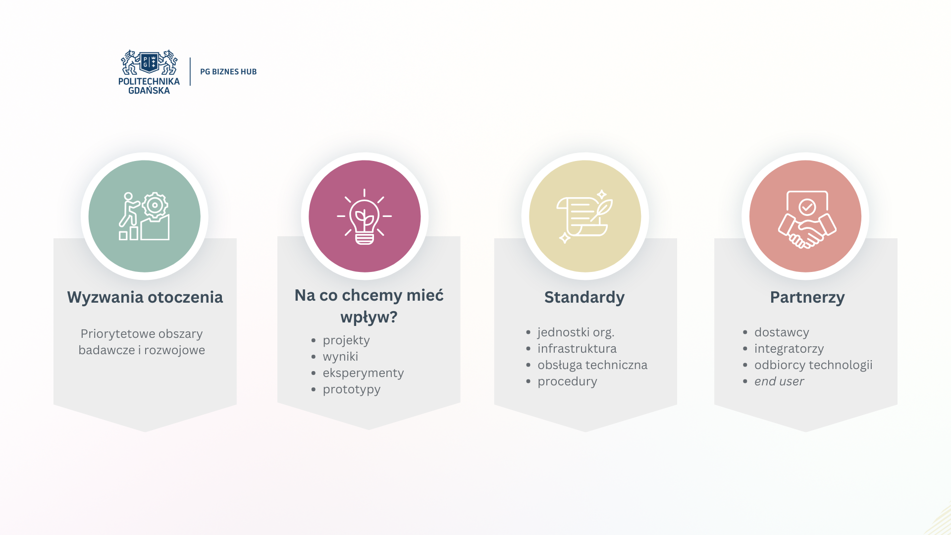 PG Biznes Hub zapewnia kompleksowe wsparcie twórcom technologii, pracownikom badawczym oraz zespołom startupowym – zarówno organizacyjne, jak i kapitałowe. Tworzymy i udostępniamy użyteczne zasoby: wzory dokumentów, transparentne procedury, a także skuteczne kanały komunikacji i jasne ścieżki współpracy z partnerami biznesowymi. Dążymy do tego, by każdy, kto chce wdrażać rozwiązania, miał do tego realne warunki i wsparcie.