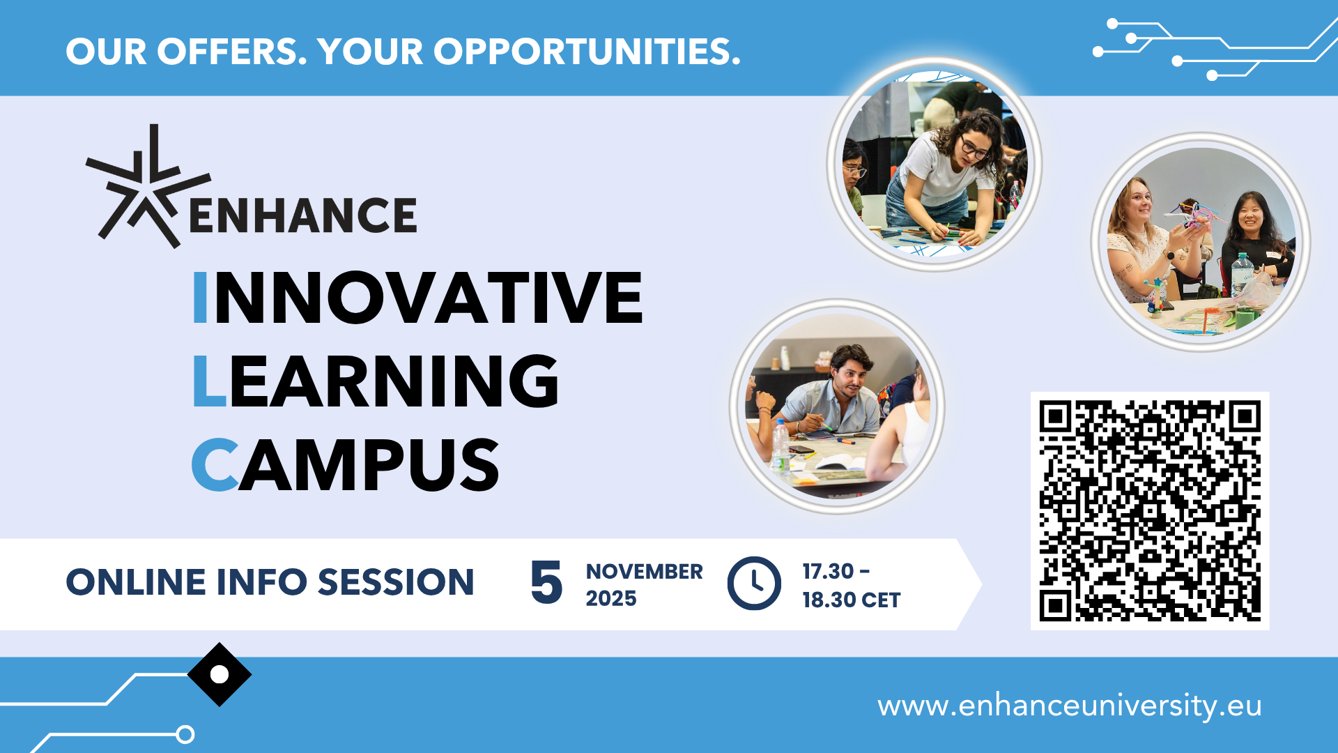 ENHANCE Alliance zaprasza studentów na spotkanie informacyjne Innovative Learning Campus (ILC). Podczas sesji uczestnicy poznają szeroką ofertę międzynarodowych, krótkoterminowych możliwości nauki w ramach ENHANCE — w tym szkoły letnie i zimowe, warsztaty oraz kursy MOOC organizowane przez 10 wiodących europejskich uczelni technicznych.
