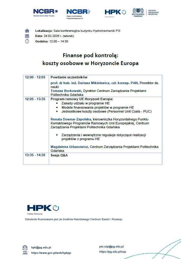 W związku z rozpoczęciem wdrażania na Politechnice Gdańskiej opcji jednostkowych kosztów osobowych (Personnel Unit Cost – PUC), których celem jest uproszczenie planowania oraz rozliczania kosztów osobowych w projektach finansowanych z programu Horyzont Europa, Centrum Zarządzenia Projektami zaprasza na spotkanie informacyjne pt. „Finanse pod kontrolą: koszty osobowe w programie Horyzont Europa”.