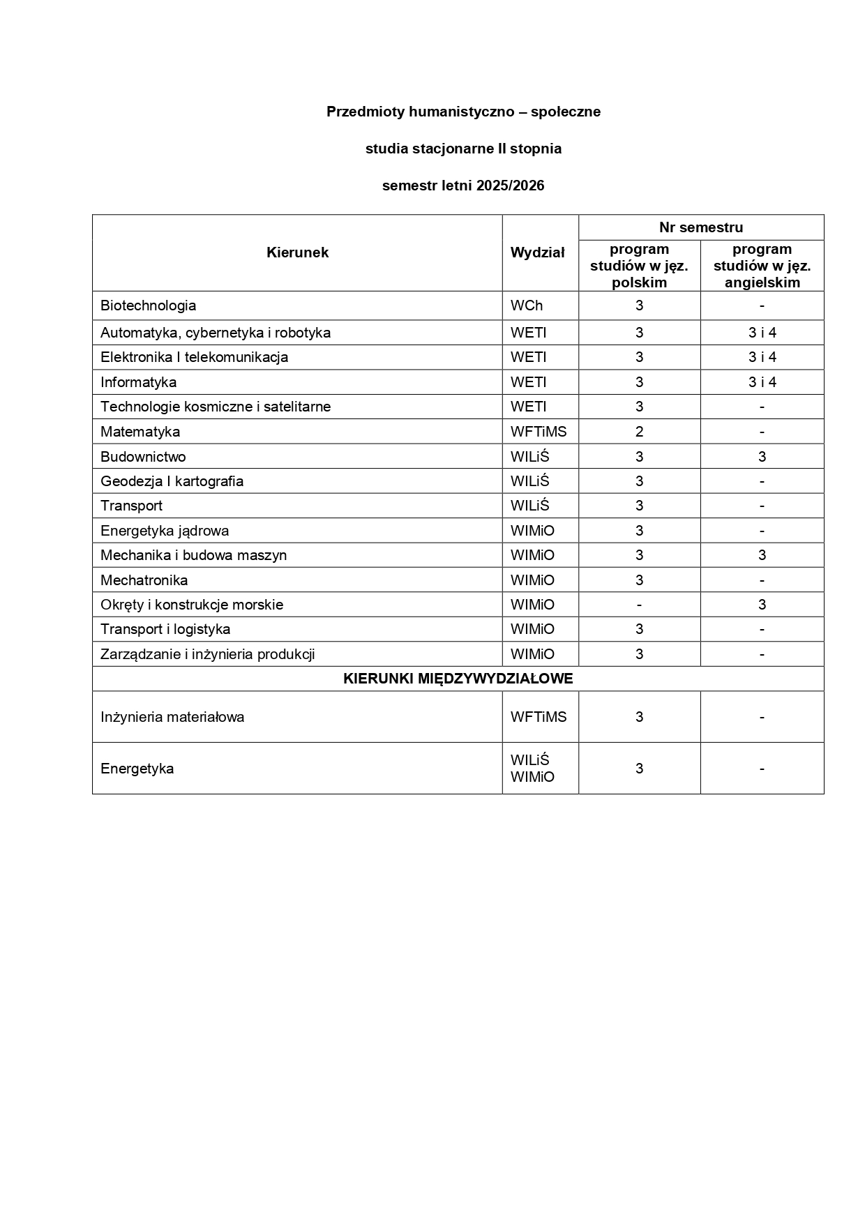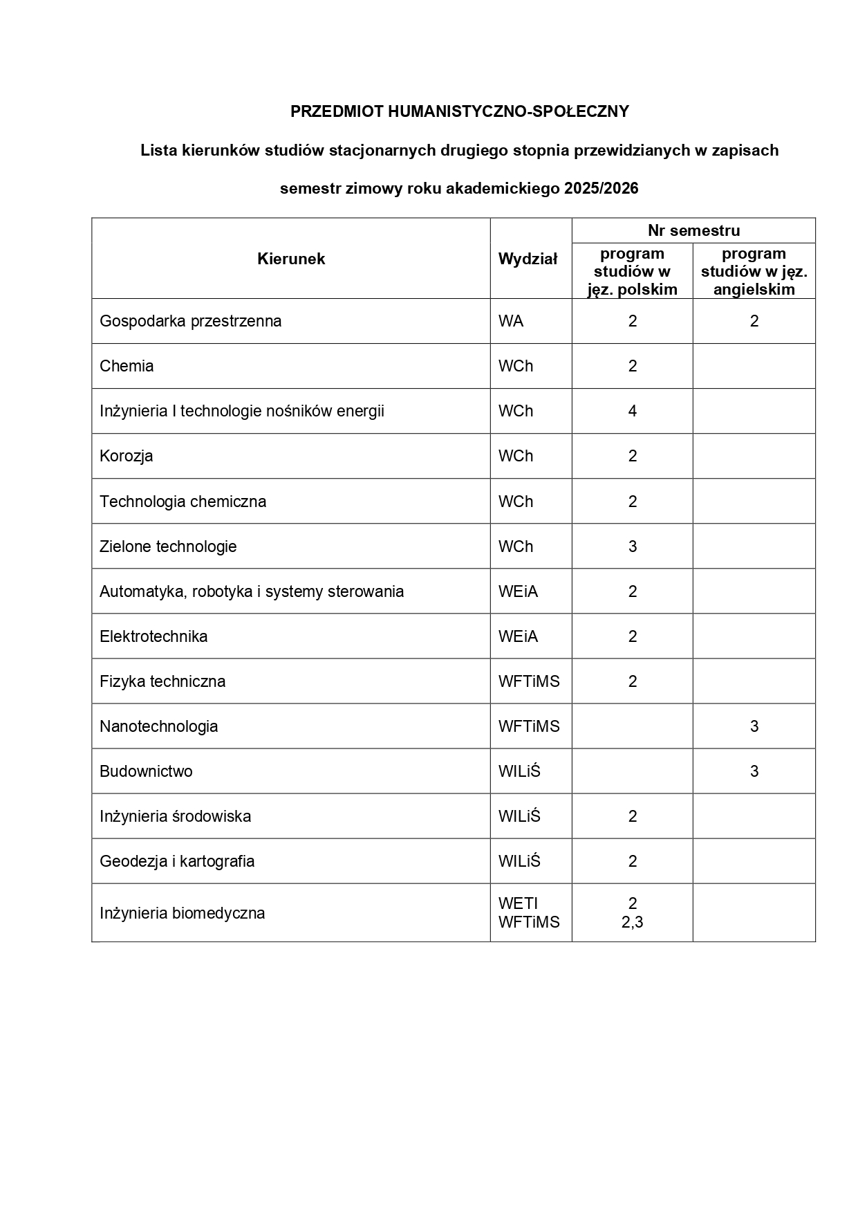 - Uczelniane fakultatywne przedmioty humanistyczne i społeczne