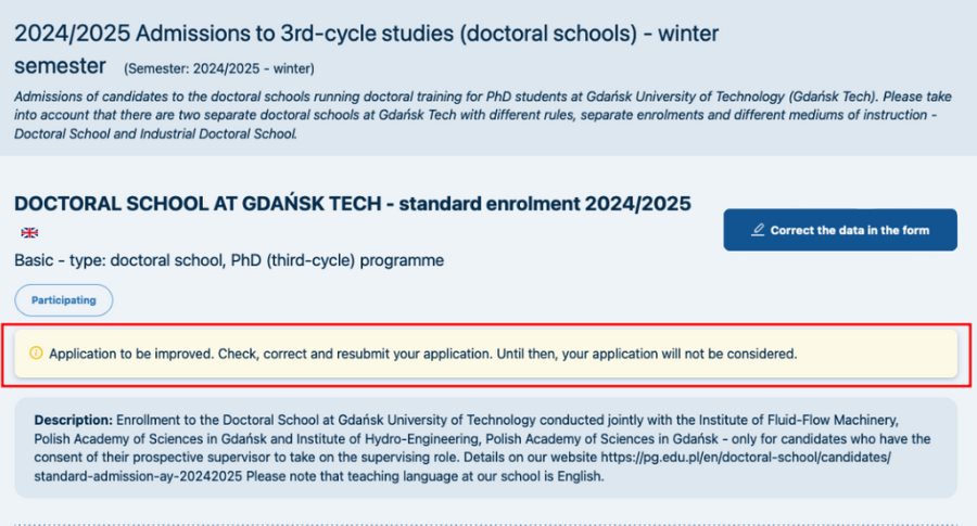 NOTE! Sending inquiries about the status of applications significantly extends the verification process, so please be patient - every successfully paid application will be verified, and the candidate will be informed appropriately. An annotation of the status of the application can be found in the area marked by the box and directly above it. The content in the box may vary depending on the status of your application.