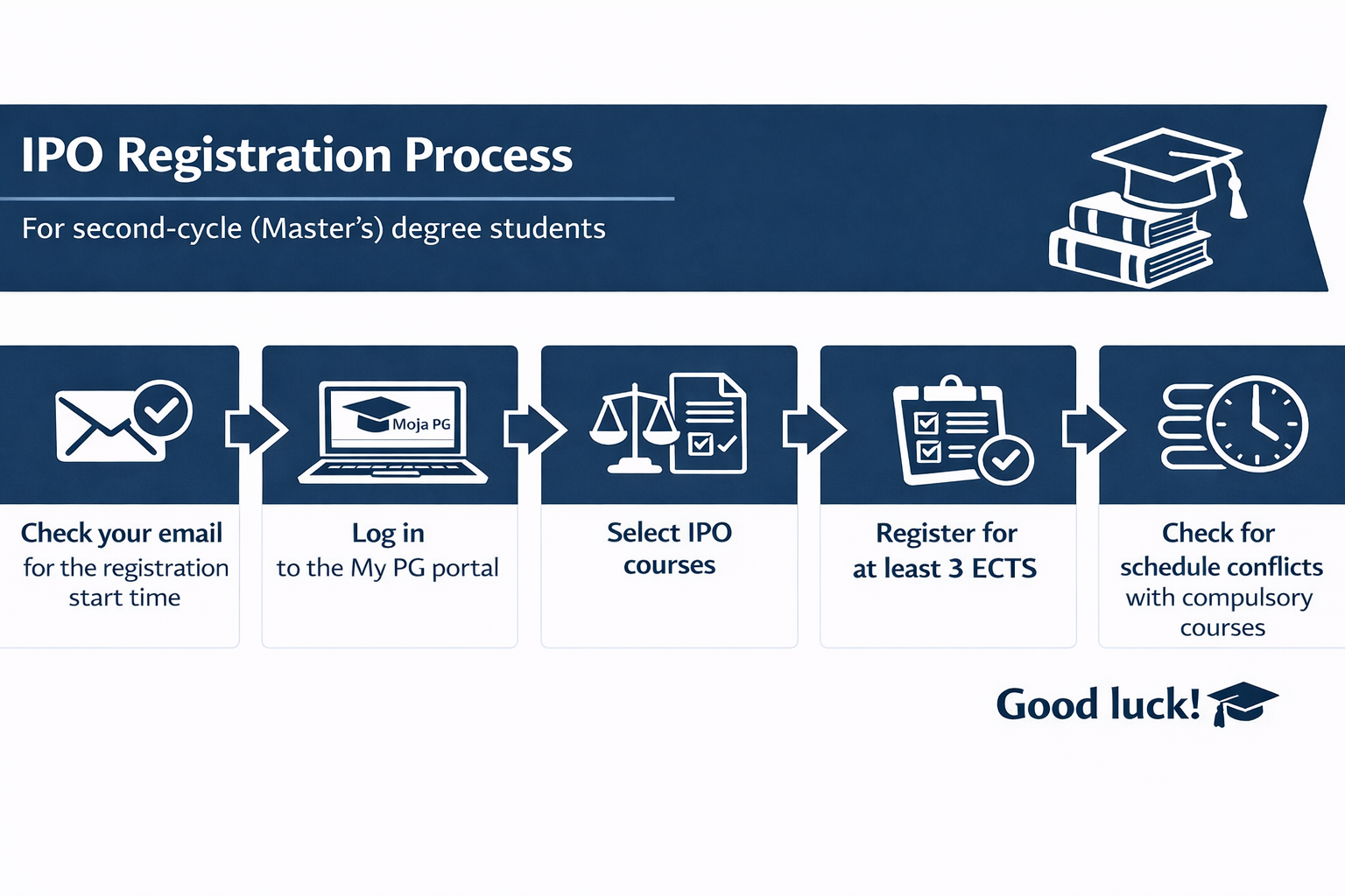 The order of participation in registration depends on the grade point average from the previous semester. Students will be divided into small groups, each granted access to registration at a specific time. You will receive information about the exact time of your slot by email via the Moja PG portal.