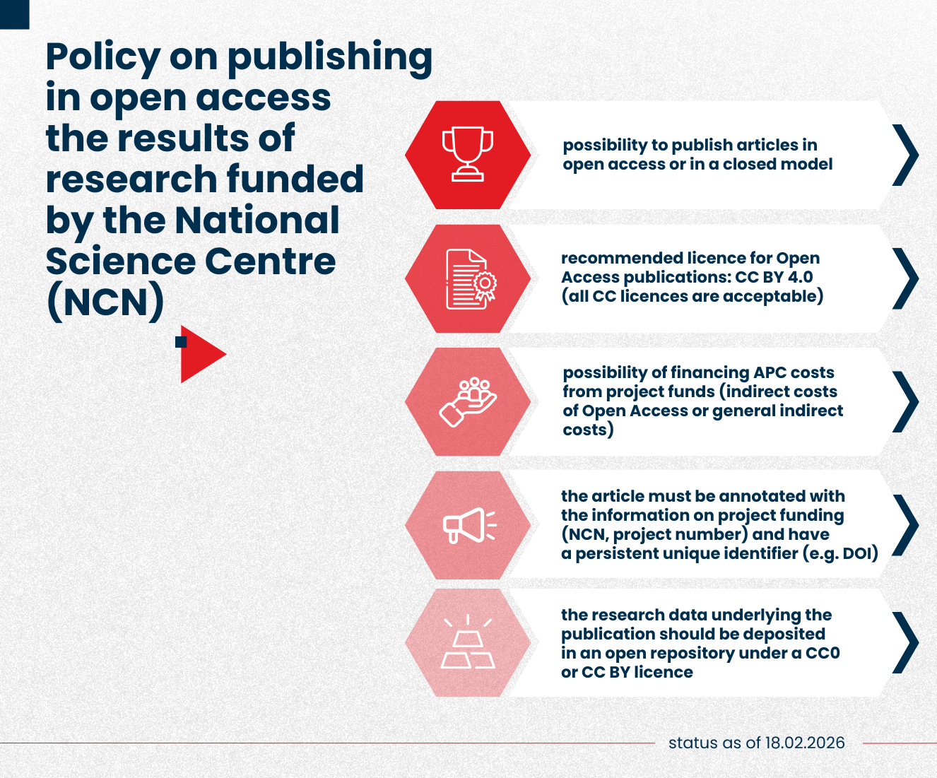 On 26 June 2025 the policy was updated by Order no 39/2025, which removed the requirement to publish in open access in calls announced from September 2025. From then on, project managers can report both open access and closed model articles in projects without any formal, financial or substantive consequences. For publication pathways for open access articles, researchers have been allowed to use any Creative Commons licence, as well as fund the cost of APCs in hybrid journals. For both the open and closed model, research data associated with published articles must be made available in an open repository, where possible under the terms of a CC 0 or CC BY licence. The NCN Director's letter of 26 June also extended the new rules to current scientific projects and activities.