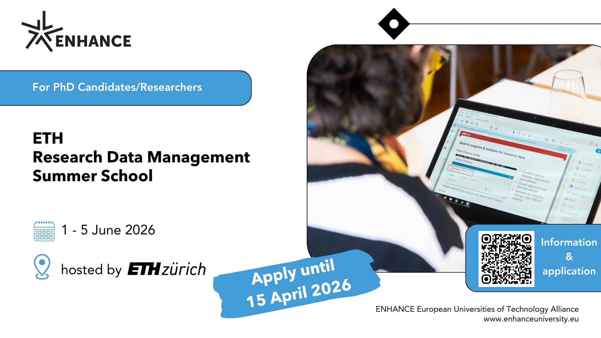 ENHANCE ILC Catalogue - ETH Research Data Management Summer School (1–5 czerwca, Zurych) – intensywny kurs zarządzania danymi badawczymi. Dla uczestników ENHANCE opłata jest pokrywana w ramach programu.