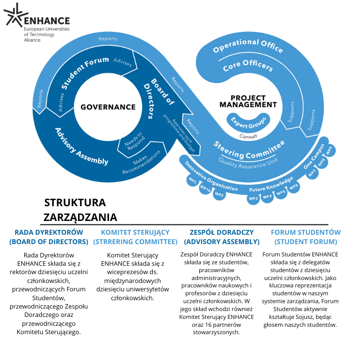 Projekt ENHANCE+ to europejska inicjatywa skoncentrowana na wzmacnianiu współpracy pomiędzy uczelniami technicznymi w celu podnoszenia jakości kształcenia inżynierskiego. Jest częścią szerszego Sojuszu ENHANCE, konsorcjum uczelni technicznych z Niemiec, Hiszpanii, Włoch, Szwajcarii, Norwegii, Polski, Szwecji i Holandii. Projekt ma na celu stworzenie bardziej zintegrowanego europejskiego obszaru szkolnictwa wyższego i jest realizowany przez cztery lata, obejmując 10 uczelni partnerskich oraz 10 pakietów roboczych (WP).