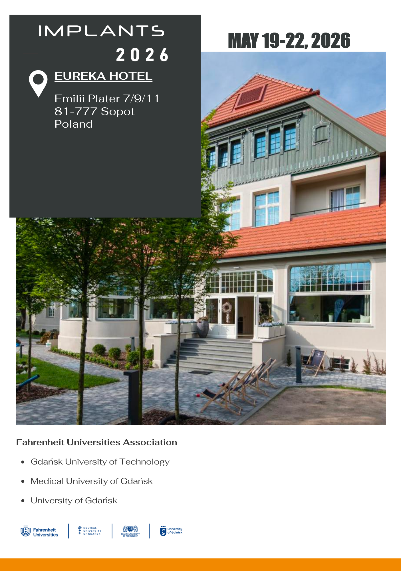 Venue dates: May 19-22, 2026 Venue address: HOTEL EUREKA Emillli Plater Street, no. 7/9/11 81-777 Sopot POLAND See more: https://eurekasopot.pl/en/ Nawigacja International Conference on IMPLANTS Venue Contact info Previous editions Follow us on Facebook and Instagram Check out our Facebook event page