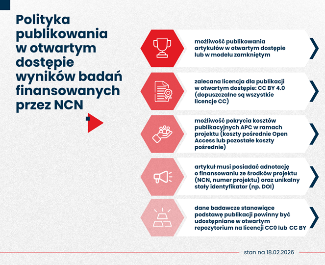 26 czerwca 2025 r. weszło w życie Zarządzenie nr 39/2025 Dyrektora NCN w sprawie „Polityki publikowania w otwartym dostępie wyników badań stanowiących efekty realizacji projektów badawczych, staży, stypendiów naukowych, działań naukowych i komponentów badawczych”, które zniosło wymóg publikowania w otwartym dostępie w konkursach ogłaszanych od września 2025 r. Od tego momentu kierownicy projektu mogą raportować w projektach zarówno artykuły w otwartym dostępie jak i w modelu zamkniętym bez żadnych konsekwencji formalnych, finansowych ani merytorycznych. W przypadku ścieżek publikacyjnych dla artykułów w otwartym dostępie umożliwiono naukowcom na stosowanie dowolnej licencji Creative Commons, a także finansowanie kosztu APC w czasopismach hybrydowych. W przypadku zarówno modelu otwartego jak i zamkniętego dane badawcze powiązane z opublikowanymi artykułami muszą być udostępniane w otwartym repozytorium, tam gdzie to możliwe zgodnie z warunkami licencji CC 0 lub CC BY. Pismo Dyrektora NCN z dnia 26 czerwca rozszerzyło nowe zasady również na aktualnie realizowane projekty i działania naukowe.