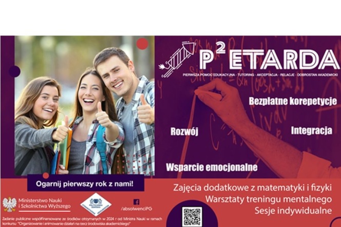 Projekt został zrealizowany we współpracy z uczelnią w ramach zadania publicznego Pierwsza Pomoc Edukacyjna: Tutoring, Akceptacja, Relacje - Dobrostan Akademicki (P2ETARDA).