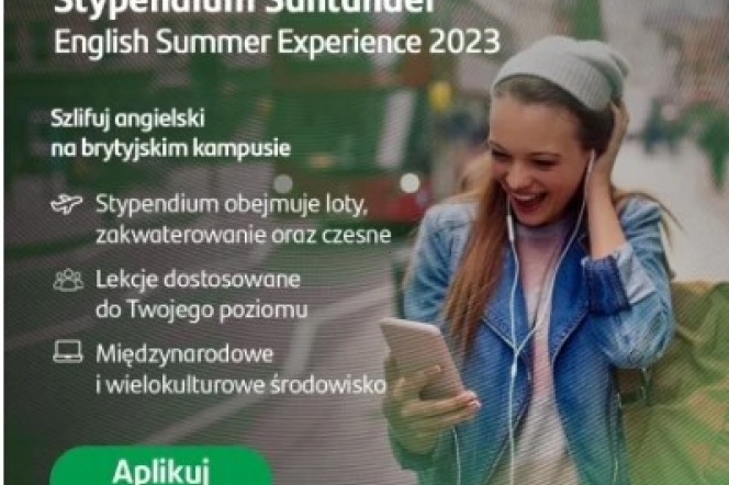 - Stypendium Santander | English Summer Experience 2023 – 100 miejsc na wyjazdowy kurs języka angielskiego na poziomach od B1 do C1 dla osób w wieku 18 – 30 lat. Uczestnicy spędzą 3 tygodnie na kampusie takich uczelni jak: Conventry University, University of East England i University of Sheffield. Stypendium pokrywa koszty czesnego, lotów oraz zakwaterowania. Zgłoszenia są przyjmowane do 30 stycznia 2023 r.