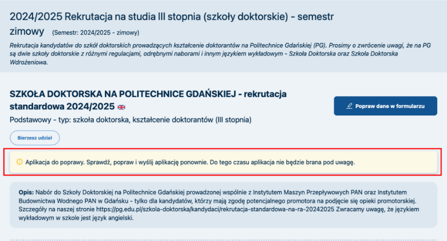 UWAGA! Wysyłanie zapytań w sprawie statusu aplikacji znacząco wydłuża proces ich weryfikacji, dlatego bardzo prosimy o cierpliwość — każda pomyślnie opłacona aplikacja zostanie zweryfikowana, a kandydat otrzyma stosowną informację. Adnotacja dot. statusu aplikacji znajduje się w miejscu oznaczonym ramką i bezpośrednio nad nią. Treść w ramce może się różnić w zależności od tego, w jakim statusie znajduje się aplikacja.
