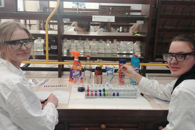 W ramach zajęć laboratoryjnych dr inż. Anna Ciborska, mgr Katarzyna Kowalewska oraz inż. Agnieszka Kierył przygotowały zestaw aż 4 doświadczeń poświęconych teoriom kwasów i zasad, kinetyce chemicznej i elektrochemii. W pierwszym doświadczeniu uczniowie badali odczyn różnych substancji znajdujących się w gospodarstwie domowym przy pomocy wskaźnika zawierającego antocyjany. Żywe barwy budziły duże zainteresowanie. Następnie wykorzystując prąd stały z baterii uczniowie dokonali elektrolizy roztworu chlorku cyny(ii), czemu towarzyszyło powstawanie efektownych kryształów metalicznej cyny. W drugiej części tego doświadczenia uczniowie prowadzili elektrolizę wodnego roztworu siarczanu(vi) sodu, którym nasączona była bibuła. Zmianę pH można było zaobserwować poprzez powstawanie różowego zabarwienia fenoloftaleiny. W ten sposób przy pomocy elektrody uczniowie mogli wykonać dowolny napis na bibule. Doświadczenie z kinetyki było najbardziej czasochłonne, gdyż uczniowie sprawdzali jak stężenie reagentów wpływa na czas rozkładu tiosiarczanu sodu pod wpływem kwasu solnego.