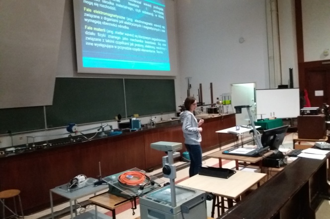 Wykład, który jak zwykle odbył się w Audytorium Maximum, został wygłoszony przez dr hab. inż. Beatę Bochentyn prof.PG. Wykładowczyni ilustrowała doświadczeniami omawiane podstawy teoretyczne dotyczące fal mechanicznych i elektromagnetycznych. Uczniowie nauczyli się klasyfikować fale, opisywać je matematycznie, poznali mechanizmy propagacji fal, zjawiska, którym fale podlegają oraz nauczyli się wytwarzać i obliczać parametry fali stojącej.