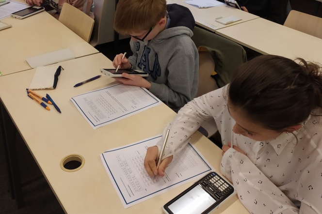 Ostatnia część – ćwiczenia. Uczestnicy rozszyfrowywali tajną wiadomość - cytat Galileusza „Matematyka jest alfabetem przy pomocy, którego Bóg opisał wszechświat”. Mieli też okazję testować rozwiązywanie układów równań na kalkulatorze naukowym ClassPad II.