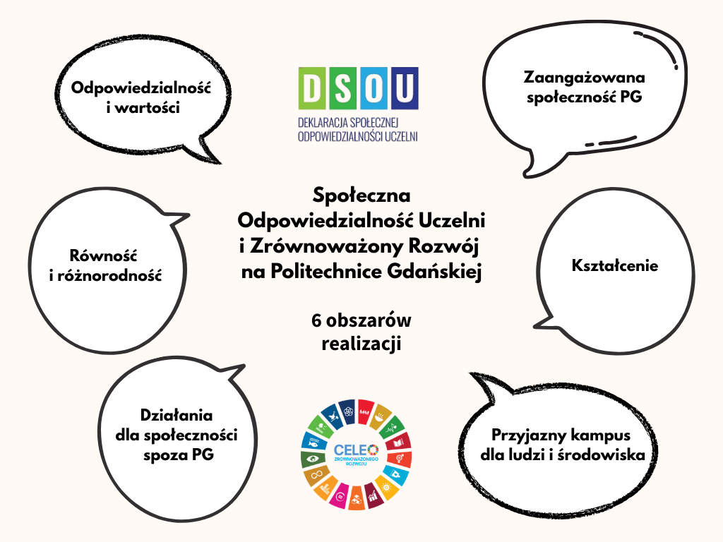 Na Politechnice Gdańskiej realizacja założeń Deklaracji SOU jest wdrażania poprzez spójny plan działań w sześciu obszarach opracowany w ramach Strategii wdrażania Celów Zrównoważonego Rozwoju i Społecznej Odpowiedzialności Uczelni: